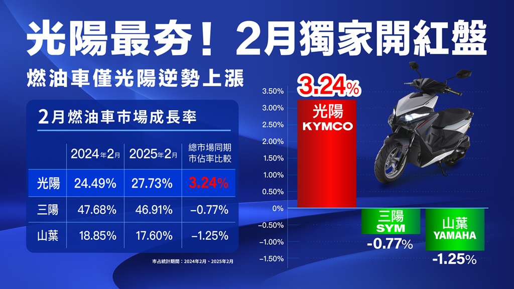 2025 年 2 月台灣機車市場呈現全面衰退的態勢,但光陽(KYMCO)卻逆勢突圍,成為唯一在燃油車市場中成長的品牌。光陽 2 月銷售達 15,977 台,以 27% 市占率穩居市場第二,並較 1 月銷量成長 46.8%,領先其他品牌。相較去年同期,2 月的總市場銷量為 59,259 台,各大品牌燃油車銷售普遍下滑,唯獨光陽市占提升 3.24%,成功在春節過後迎來「開紅盤」。