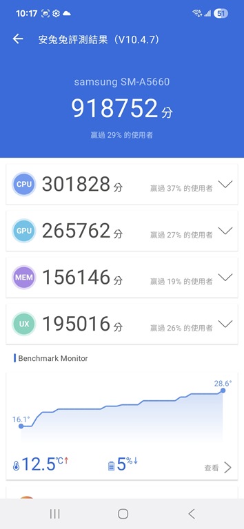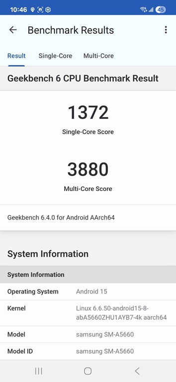 在效能跑分部分,安兔兔得到將近 92 萬分、Geekbench 部分,單核 1372、多核 3880分,整體表現符合中階機的定位。