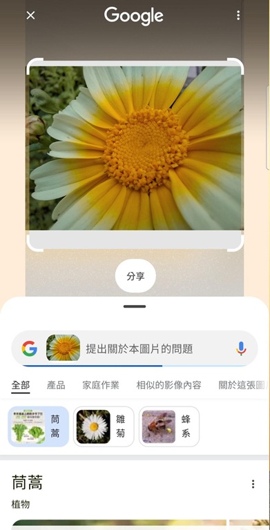 有趣的是,原本拍下一朵以為是菊花的花朵,沒想到辨識後它居然是茼蒿。這功能真的建議大家多多善用,可以發現,多的是,你不知道的事?