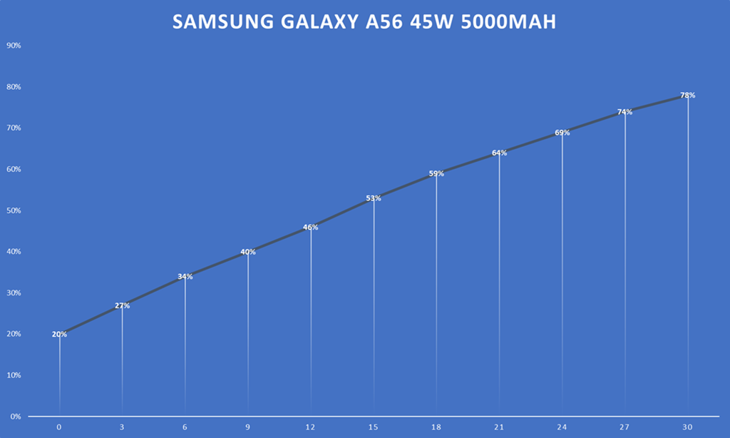 電池的部分,容量與上一代一樣是 5,000mAh,但總算升級支援 45W 快充了,實測充電速度,30 分鐘可從 20% 充到 78%,比起之前 A55 的 25W 真的好太多。