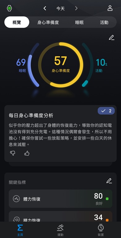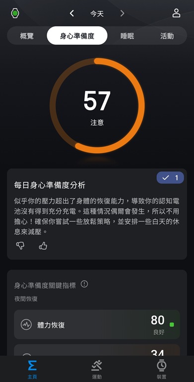 除了睡眠外,Amazfit Active 2 也會綜合各項數據,分析出身心準備度。