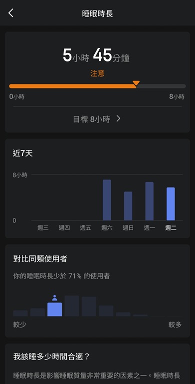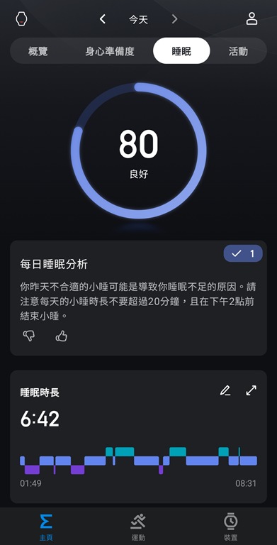 另外也會提供睡眠分析,並給予建議,像我就是傍晚睡了一下,不小心睡太久,導致晚上睡不好,這部分它也會細心提醒。