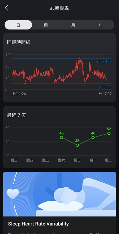 特別值得一提的是 HRV 睡眠分析,它不僅提供一般的睡眠長度、深淺睡比例、REM 快速動眼期,還能透過心率變異性判斷睡眠恢復狀況。這功能對於經常晚睡、壓力大的使用者特別實用,不僅能了解自己「睡了多久」,更重要的是「睡得好不好」。