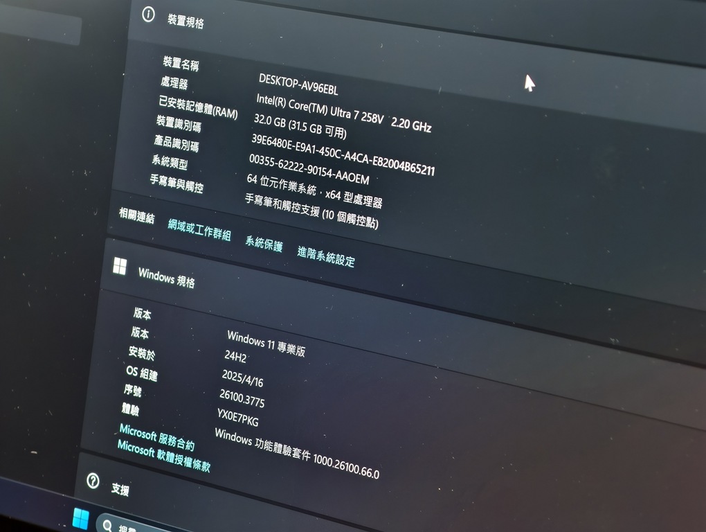 這次 Intel Core Ultra 7 258V 搭載的是 Intel Core Ultra 7 258V 處理器,結合 32GB LPDDR5x 記憶體與 1TB PCIe 4.0 SSD,整體效能在輕薄筆電中表現很出色。無論是處理多工作業,像是開著 Chrome 跑十幾個分頁,並同時使用 Office 處理文書、聽音樂、修圖,還是進行中等程度的影片剪輯,都能保持流暢。