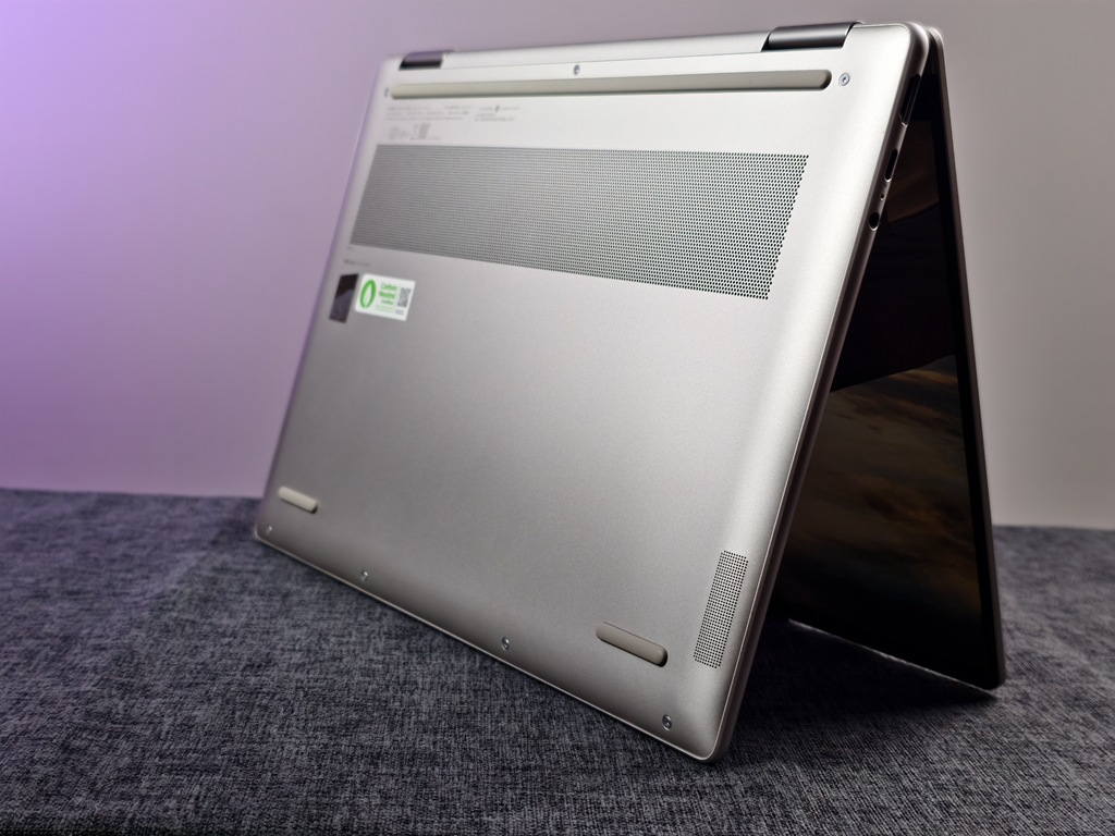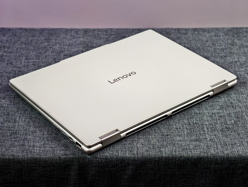 第一次拿起 Yoga 7 2-in-1,你很難不注意到它的設計細節。上蓋是結合回收鋁合金與矽膠人造皮革的雙材質處理,不但環保,也讓整體質感大加分。
