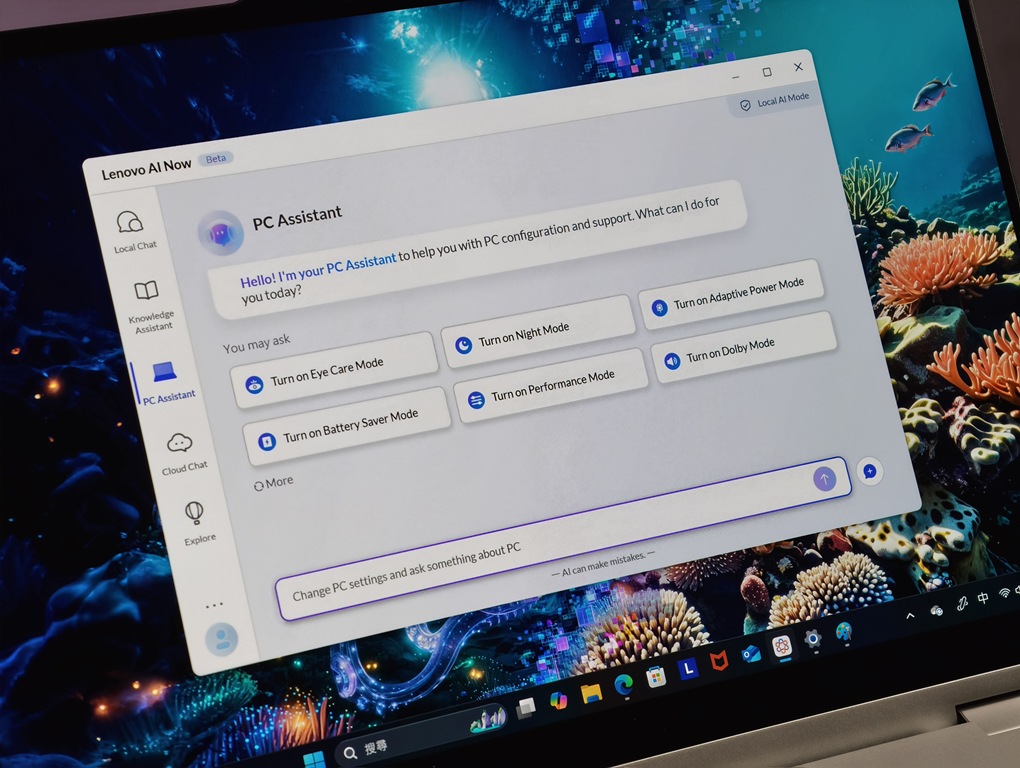 更厲害的是它內建的 Intel AI Boost 晶片,也就是 NPU,有著超過 40 TOPs 的運算能力,而且不需要雲端就能本地進行 AI 運算。搭配 Lenovo 推出的「AI Now」功能,使用者可以在不連網的情況下進行語音操作、內容摘要甚至搜尋文件資料,完全保留隱私而且反應非常迅速。