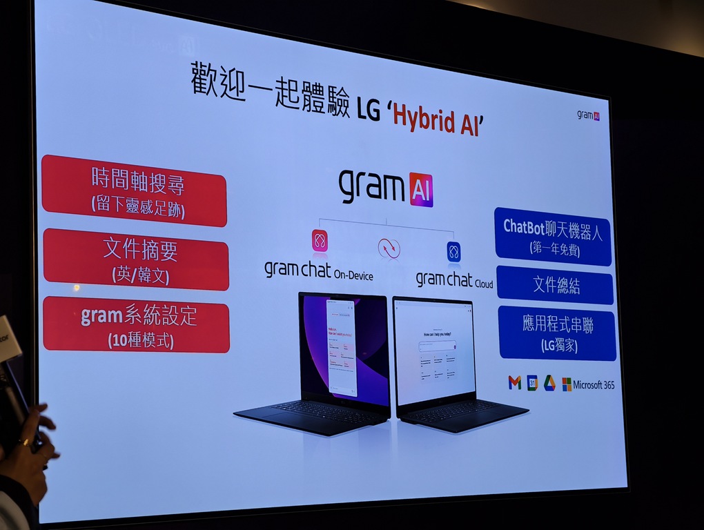 除了硬體升級,這次更加入智慧元素。LG gram Pro 系列內建 LG 自家開發的 AI 助理功能「gram Chat」,提供離線與雲端兩種模式。即使在沒有網路的情況下,也能完成文件摘要與翻譯,方便旅途中或臨時開會時使用。而線上版則整合 Google Workspace 與 Microsoft 365,只要輸入關鍵字,就能快速搜尋文件、撰寫郵件或安排會議,不論身處何地,靈感與工作進度都能順暢延續。