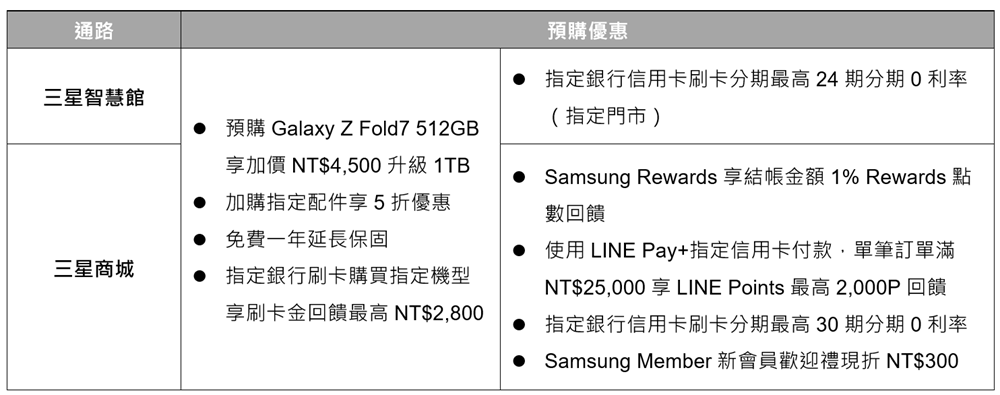 在實體通路方面,三星智慧館還提供加價升級 1TB、配件半價、免費延長保固、指定銀行最高 NT$2,800 刷卡金與分期 0 利率等預購優惠;線上商城亦有 Samsung Rewards 點數回饋、LINE Pay 刷卡優惠與新會員現折 NT$300 等方案。