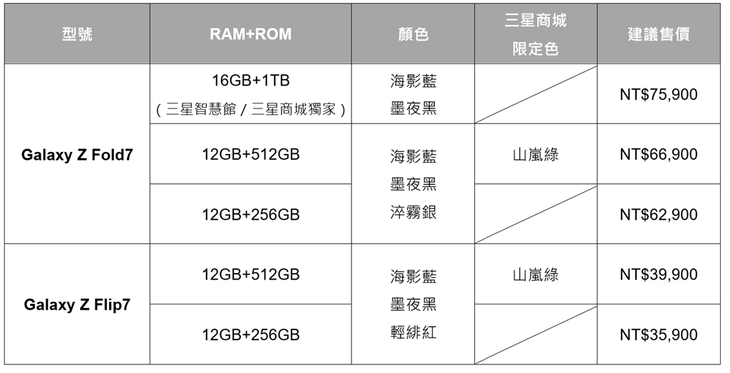 Galaxy Z Fold7 提供最高 1TB 儲存版本,建議售價 NT$75,900,還有多款儲存與顏色選擇,包括海影藍、墨夜黑、淬霧銀與山嵐綠;而 Z Flip7 則從 NT$35,900 起,延續經典的摺疊造型設計,搭配新色輕緋紅與山嵐綠。