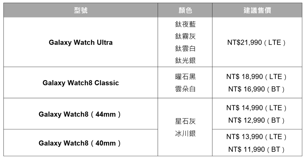 除了手機產品,三星也同步推出全新 Galaxy Watch8 系列,包含 Galaxy Watch8、Watch8 Classic 與首次亮相的 Galaxy Watch Ultra。建議售價自 NT$11,990 起,支援 LTE 與藍牙兩種版本,並推出鈦光銀、星石灰、曜石黑等多種配色。預購期間同樣為 7 月 10 日至 24 日,參與預購可享延長保固、錶帶折扣,以及限量無線充行動電源等贈品。