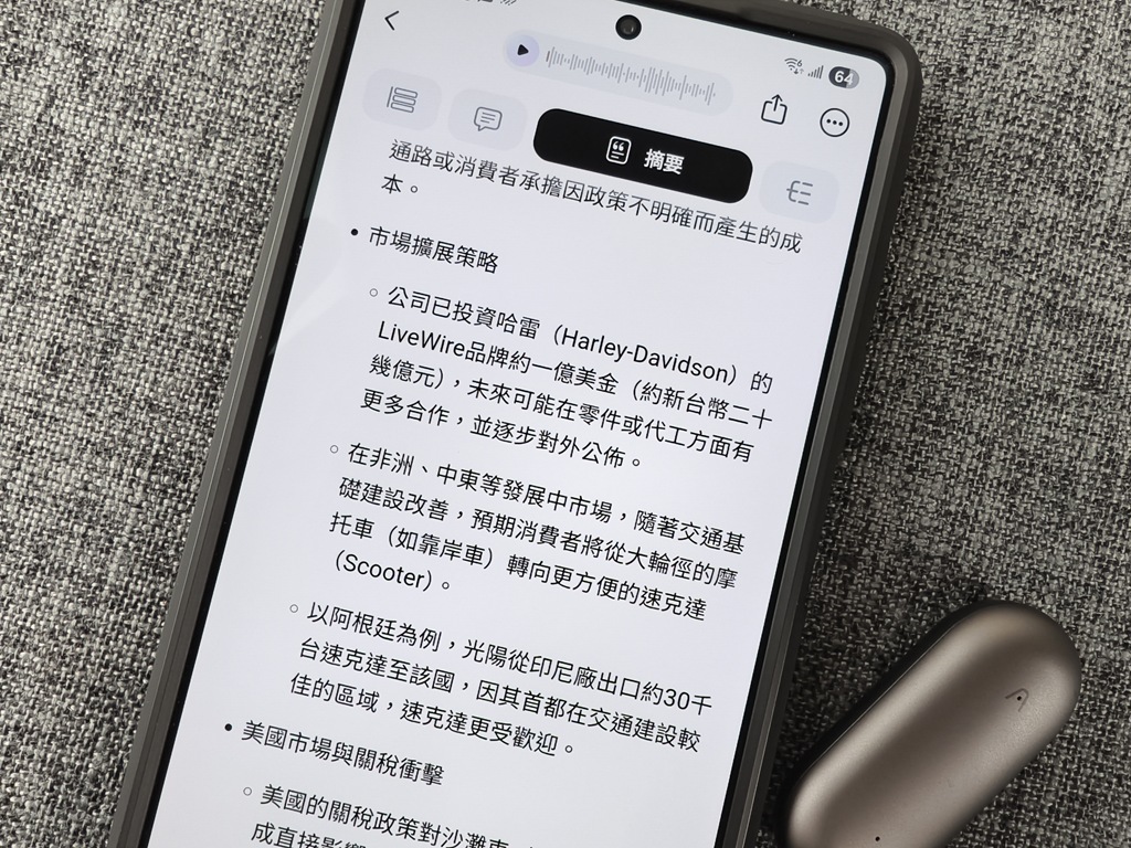 逐字稿完成後,也會同步生成摘要,有趣的事情就在摘要出現了,原本語音辨識有誤差的 line wire 與口豆,在 AI 的理解後,就轉變成正確的 LiveWire 與 Gogoro。