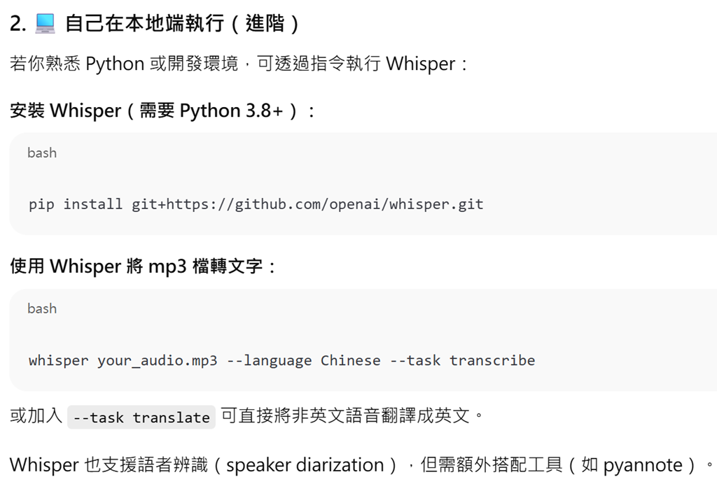 雖然說錄音品質非常重要,但我認為無論是 PLAUD NOTE 或是 NotePin 的關鍵核心,就是 PLAUD App。目前我用過語音辨識最準確的 AI 功能,就是 OpenAI 所開發的 Whisper 自動語音辨識模型,要怎麼使用呢?大家不妨直接在 ChatGPT 上查看如何安裝使用,相信不少朋友會知難而退。