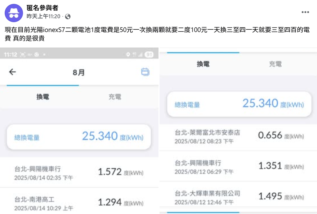 日前在 Ionex 社團一則匿名網友分享騎乘光陽 Ionex S7 經驗,提到換電成本過高。他表示:「1 度電費是 50 元,一次換兩顆電池就要 100 元,一天換三四次下來,光是電費一天就三四百元」,這發文讓不少人感到驚訝,但這樣的情況真的是一般通勤族的日常嗎?實際深入了解後,其實背後更應該被看見的,是使用情境與資費選擇不對等的問題。