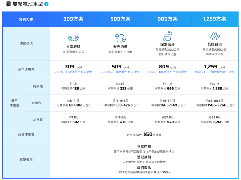 假設他選擇的是 309 元方案,全部都是使用換電方式,將會超出 55 度,那八月所要負擔的費用就等於 55*50 + 309 = 3059 元,真的是非常昂貴。但如果是選擇 1259 元方案,內含 3100 電池使用費折抵金,也就是純換電可抵 62 度電,那麼預估八月 60 度騎乘量並不會超出可折抵量,所要負擔的費用只有 1259 元。所以如果選錯方案,這一來一回要繳的費用就差了 1800 元,這差距非常可觀。當然如果更省,可以選擇有充換合一車種,以 1259 方案來說,可以折抵到 88.6 度電,更划算。