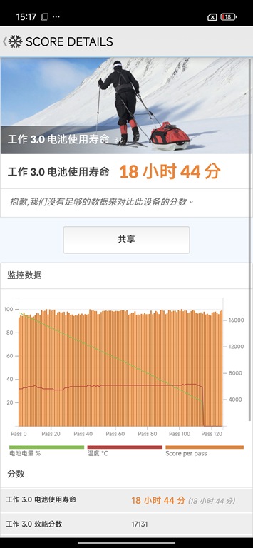 續航力一向是 T 系列的賣點之一,這次 Xiaomi 15T Pro 升級搭載 5500mAh 大容量電池,比 Xiaomi 14T Pro 的 5000mAh 還要再多,實測日常使用(開啟自動螢幕更新率、Wi-Fi 連線、輕度拍照與影音播放),可以撐到一天以上,透過 PCMark 工作 3.0 實測,電池電量從 100% 至 20% 為 18 小時 44 分鐘,續航表現確實出色。