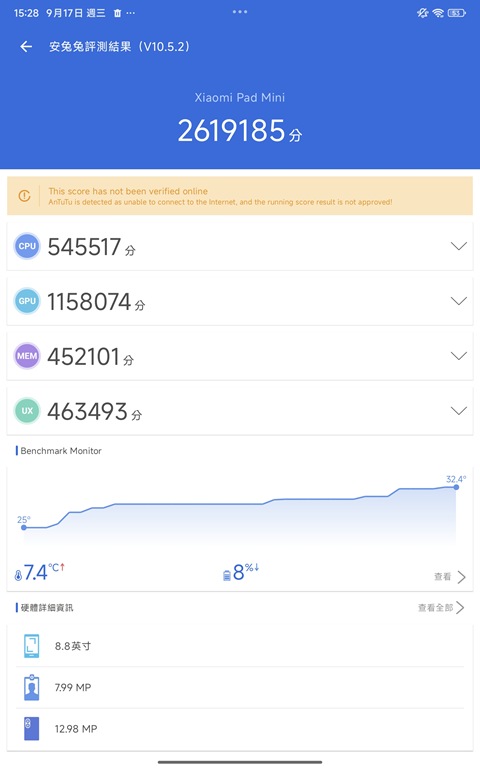 Xiaomi Pad Mini 直接搭載與 Xiaomi 15T Pro 同級的 Dimensity 9400+,採用 3nm 製程,最高主頻 3.73GHz,這樣的配置可以說是「平板界小鋼炮」,設計上特別將晶片放在中央、電池分置兩側,讓橫向握持時溫度分布更均勻,長時間遊戲手感不會過熱。