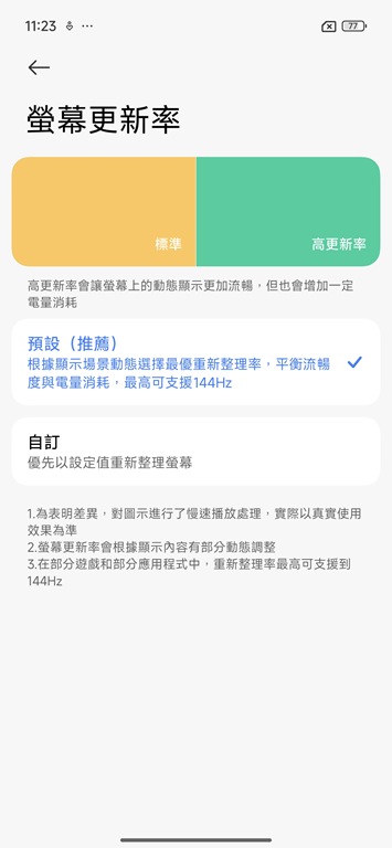 設定裡可以選擇螢幕更新率,如果沒有特別需求的話,直接使用預設的 144Hz 自適應更新率,讓系統自動判斷是最好的,也相對可以在維持視覺體驗下更省電。
