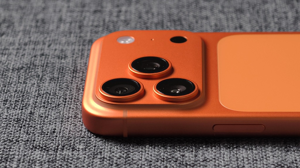 這次實測使用的是宇宙橙的 iPhone 17 Pro,先從外觀設計講起,雖然有不少人對相機模組的造型感到意見兩極,不過實際看起來倒是覺得滿有特色,邊緣的銜接設計也不錯,放在桌上不會晃動,整體質感比前代更穩重。