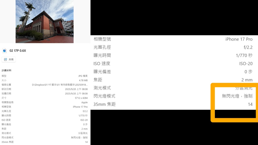 超廣角部分先說一個比較特別的,雖然相機介面上標示的是 0.5X,但拍出來的實際數據是 14mm,這部分提供給大家參考。