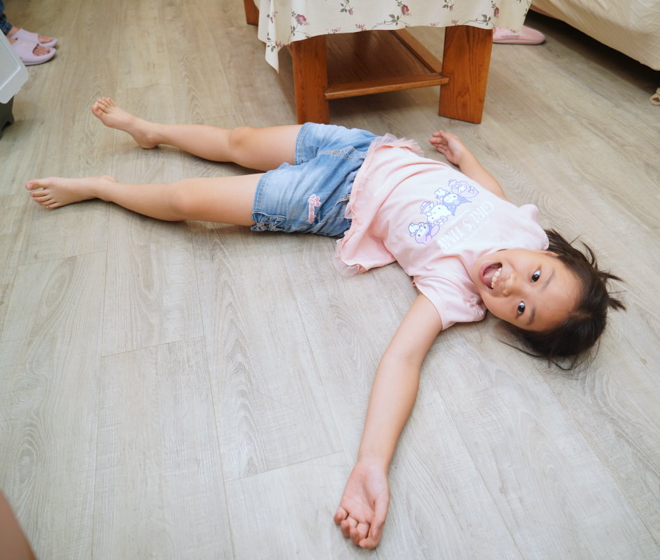 ▼小朋友玩累了有時候還會直接躺在地上,這時候不用特地將導風板吹往牆壁,調成防直吹功能就不會吹到身體,吹久了也不會覺得不舒服。
