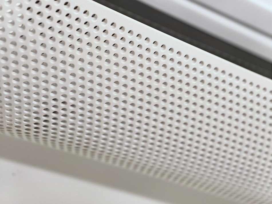 ▼仔細一看才知道細節滿滿,兩片水平導風板上結合了5013個微孔矩陣,仿效高爾夫球球面凹槽的曲面設計,加上獨特的沙漏結構,相較於一般孔洞來說更能有效分散、轉移氣流,當冷空氣通過微孔時,氣流就會被均勻的壓縮、打散並擴散至室內空間,讓冷風漸漸在空間中蔓延開來,有點像是到山上爬山時那種霧氣飄緲的清涼感,不會有強勁的氣流感,既乾爽又舒適。
