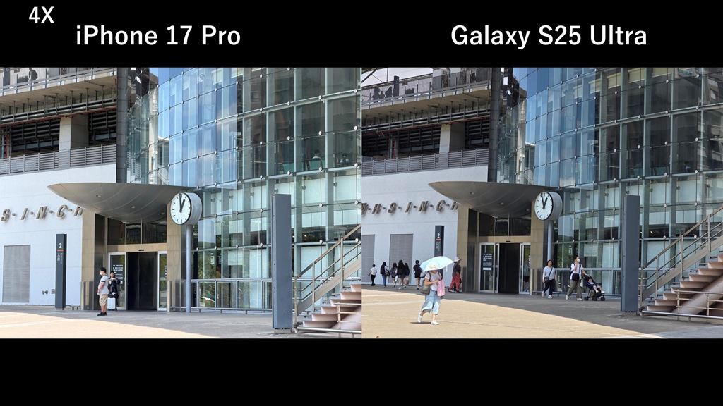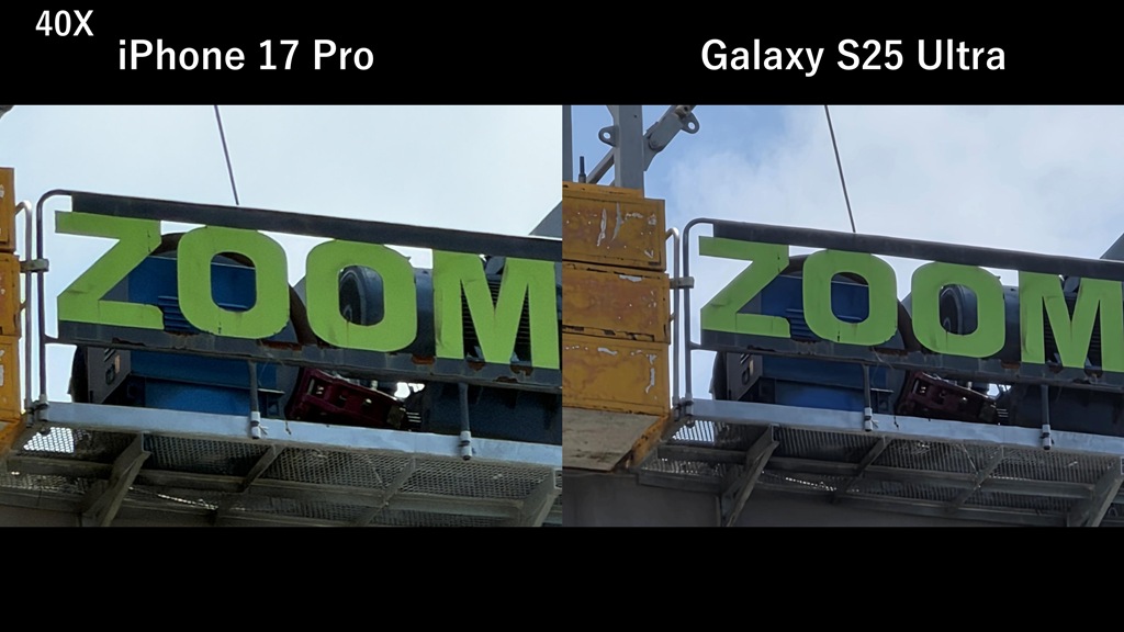 到了數位超長焦(20X 到 40X),S25 Ultra 明顯以更成熟的演算法取得壓倒性勝利,不論日夜間,畫面清晰度與實用性都遠勝 iPhone 17 Pro。即便有明顯的 AI 修飾感,但在可用性上仍是較佳選擇。