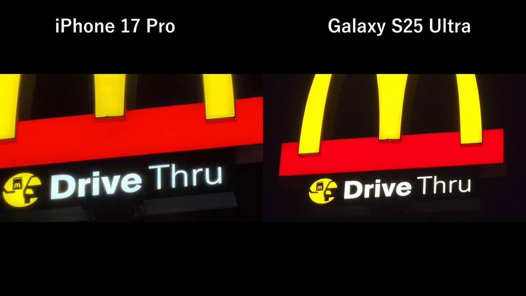 在超廣角方面,S25 Ultra 的感光元件與光圈規格稍優,視角也較寬廣。不過日間拍攝時,iPhone 17 Pro 呈現的畫面更鮮明;夜拍時,iPhone 的對比與色彩表現也更討喜,但放大細節後,S25 Ultra 的細節與高光控制則更為精緻。
