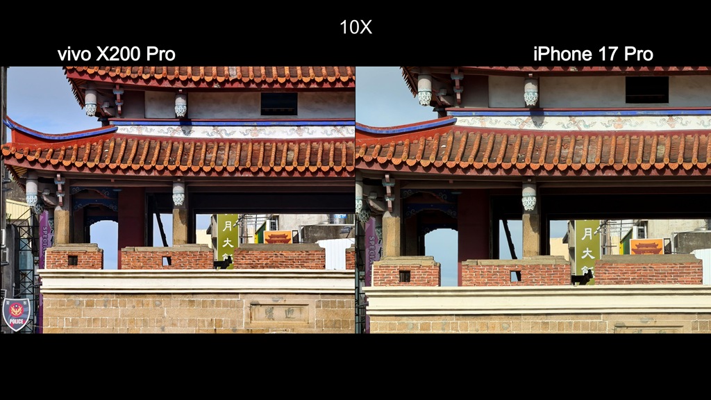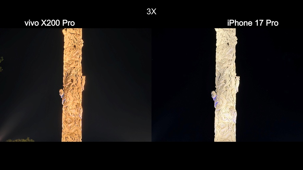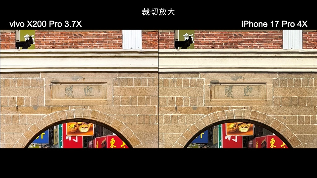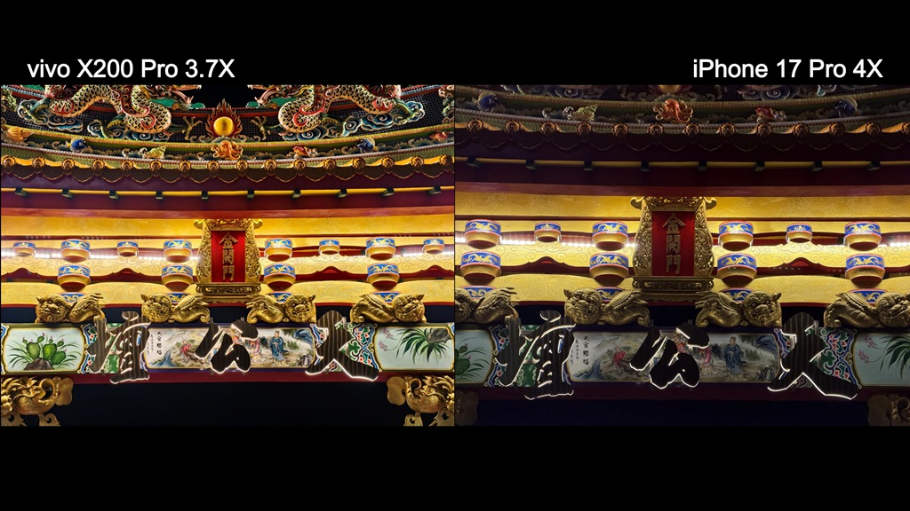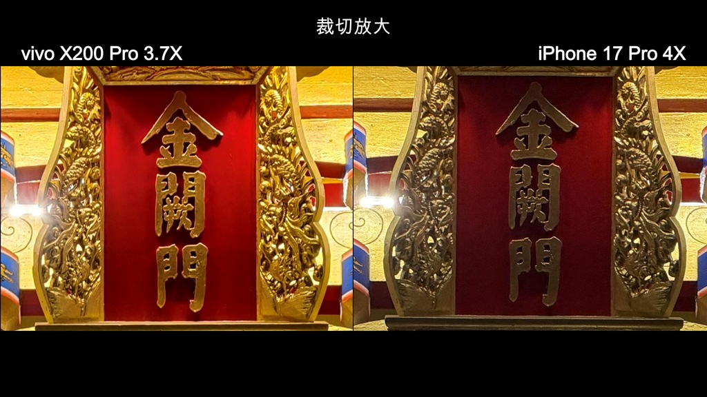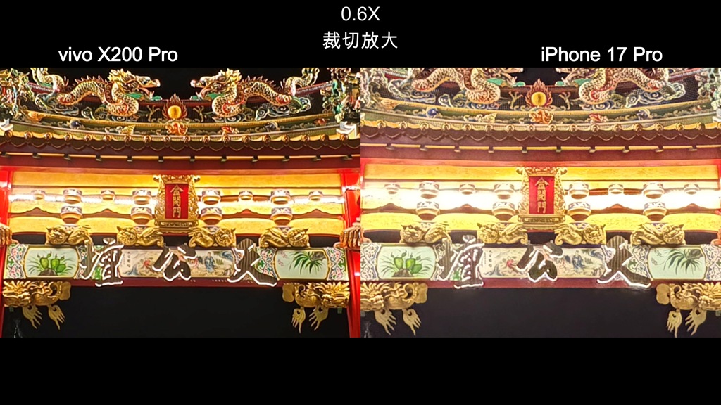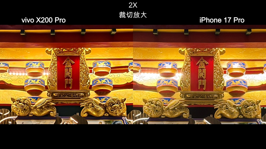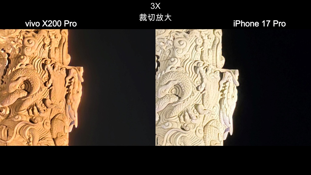 不過有趣的是,iPhone 17 Pro 的夜拍數位放大在這部分竟然略勝 X200 Pro,展現出強化後的演算法實力。