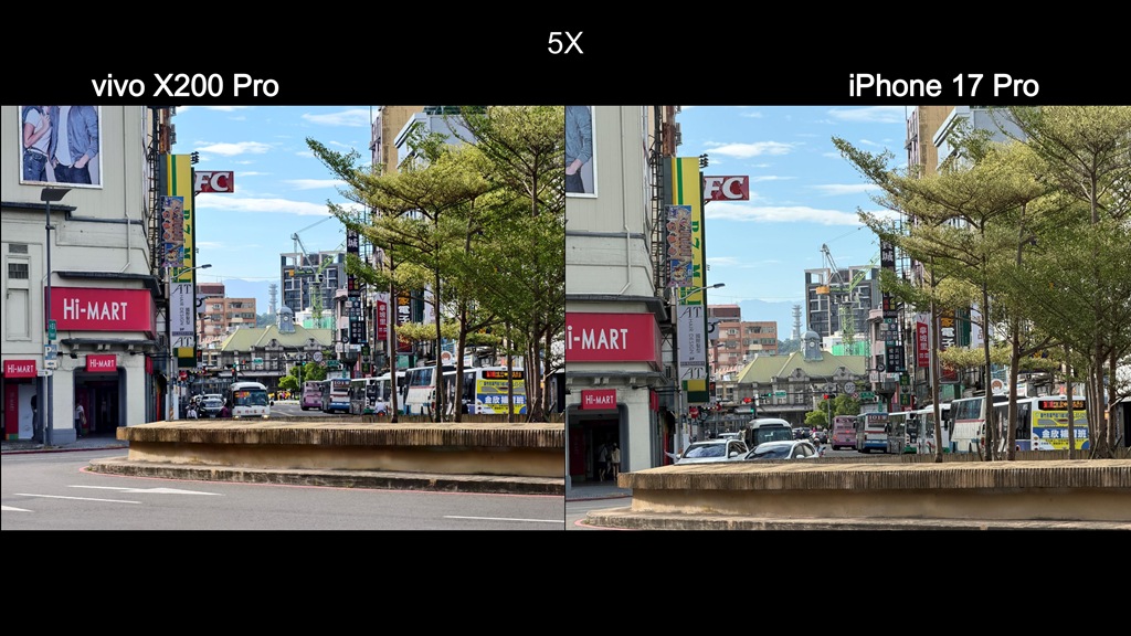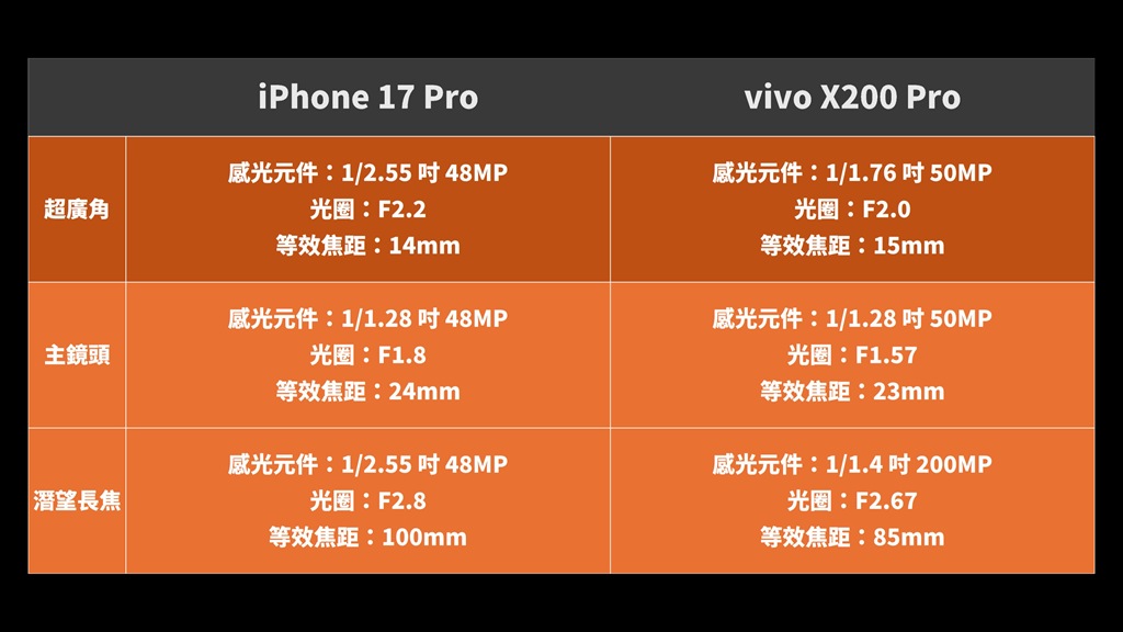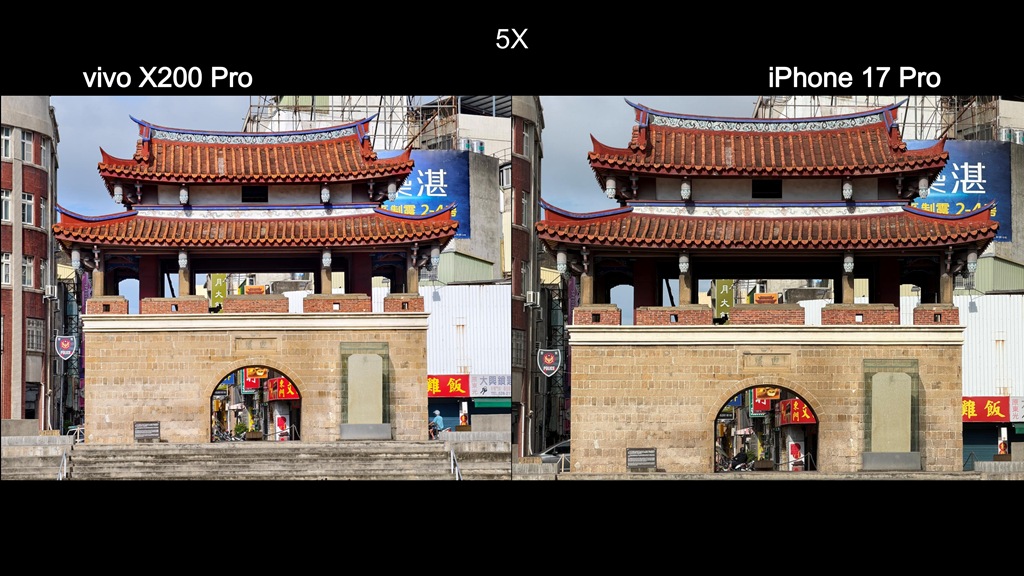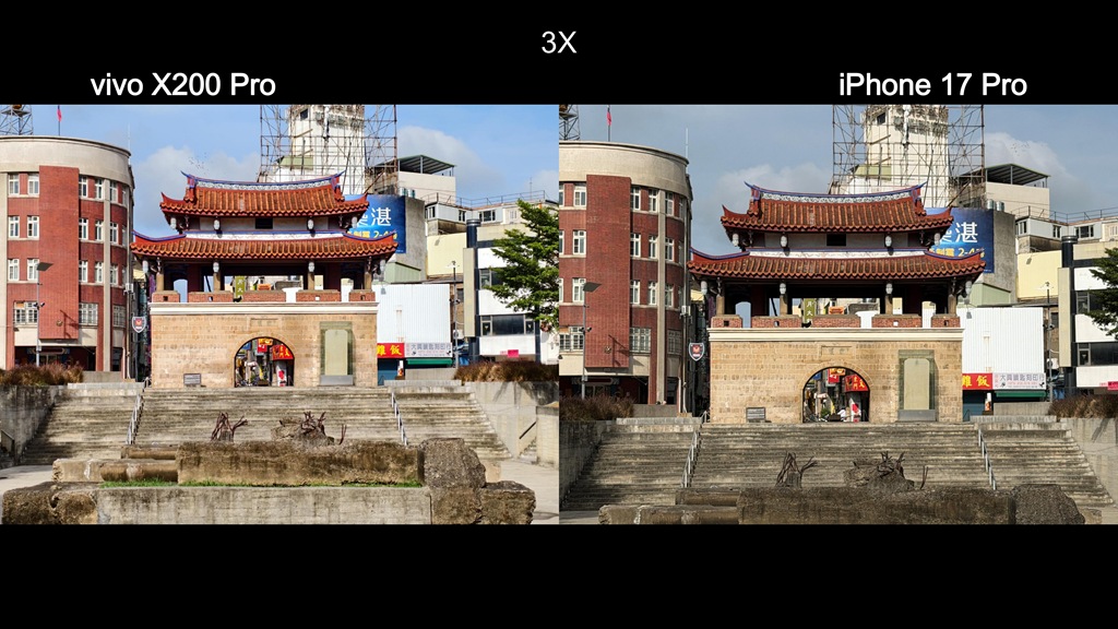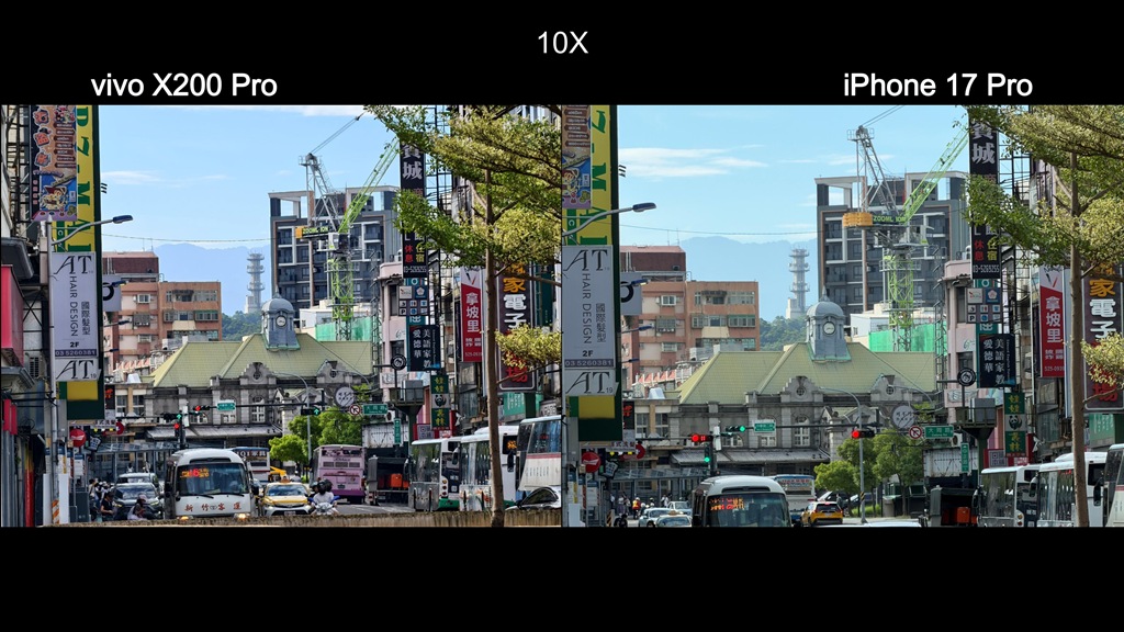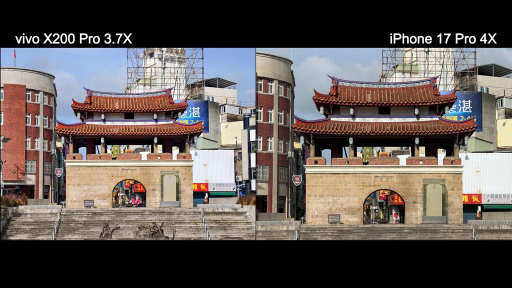 iPhone 17 Pro 這次不只延續蘋果一貫穩定的錄影能力,在 4X 光學與 8X 類光學焦距上也下了不少功夫。不過 vivo X200 Pro 不容小覷,不僅搭載兩億畫素的 HP9 感光元件,在光圈與焦段配置上也毫不妥協,堪稱長焦王者。