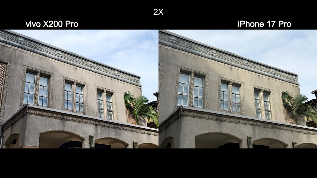 主鏡頭部分則是一場五五波的拉鋸戰。兩者在白天 1X 焦段下細節表現不相上下,但進入 2X、3X 焦段後,X200 Pro 微幅領先。