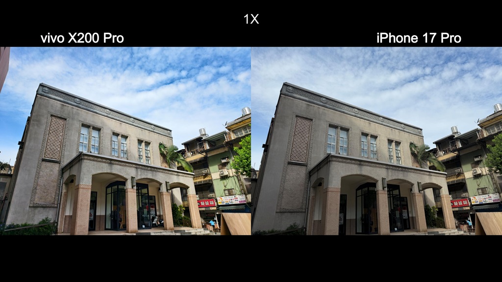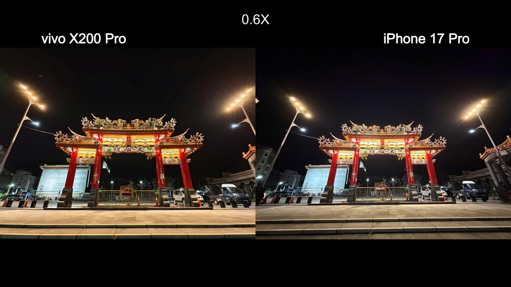 先從超廣角鏡頭談起。vivo X200 Pro 的感光元件與光圈配置都較 iPhone 17 Pro 更具優勢。白天拍攝時,X200 Pro 的色彩更飽滿、HDR 效果也更討喜;而 iPhone 的畫面則較銳利,視角也更廣。夜拍方面,X200 Pro 明顯在雜訊控制與亮部抑制上表現較佳。