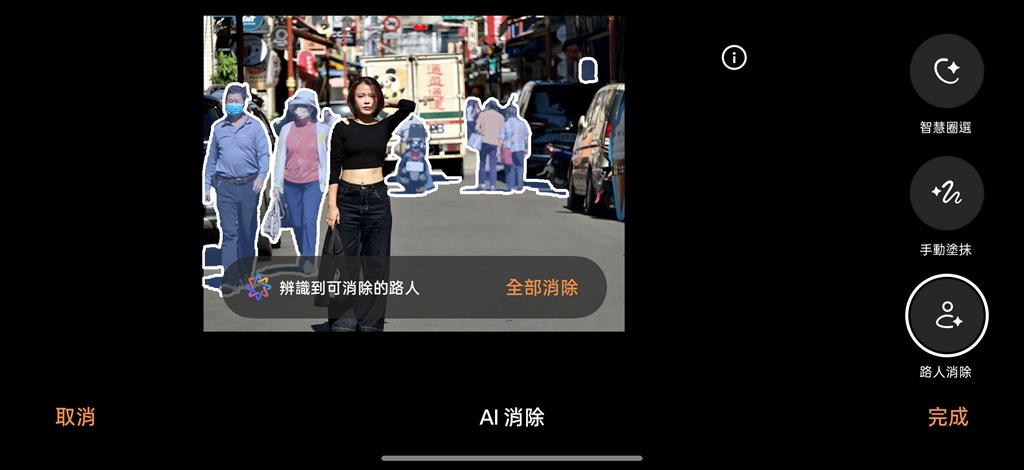 對了,旅行中拍攝人像,有時會想要營造人群熱鬧的氣氛,有時又想要讓路人消失只留著你一人的孤寂感,雖然無法控制路人來往,但 AI 可以。這時候直接使用 AI 圖像助理中的路人消除功能,就可以完成。