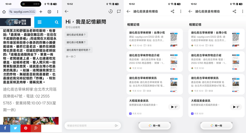 這個功能在我這趟旅行中相當實用,例如當朋友突然說要去某家名店傳個訊息、網址或是資訊來,我馬上按下一鍵閃記,系統就會自動記下時間與地點,也可以記在行事曆上,時間到再打開記憶倉用語音確認就可以。