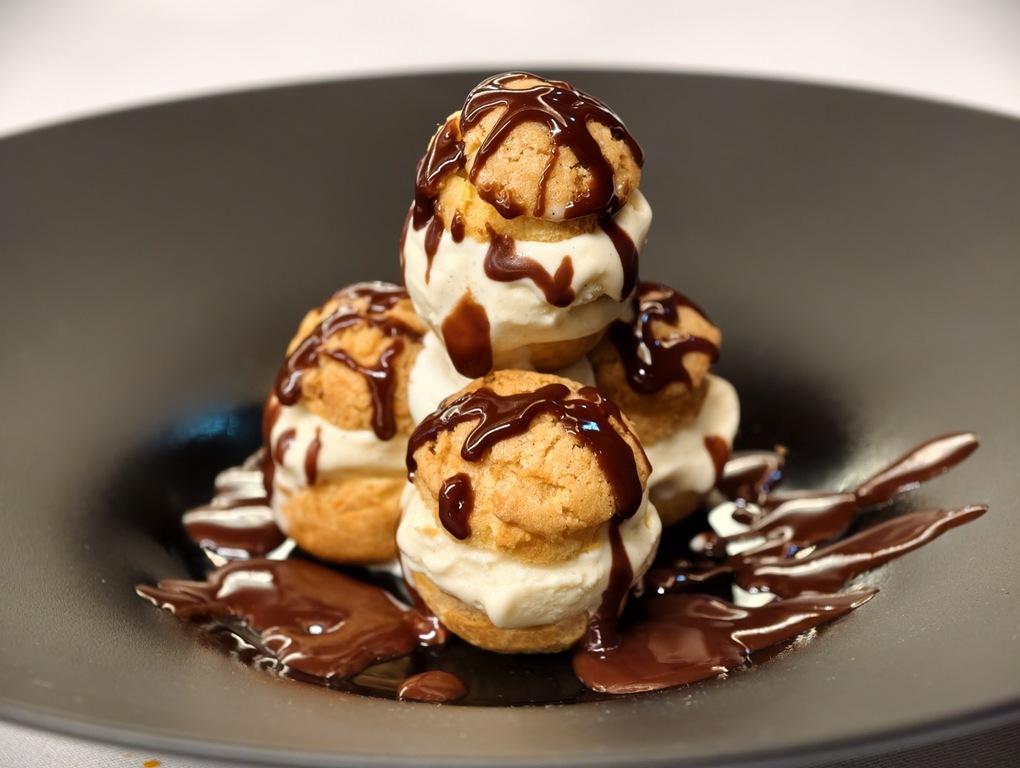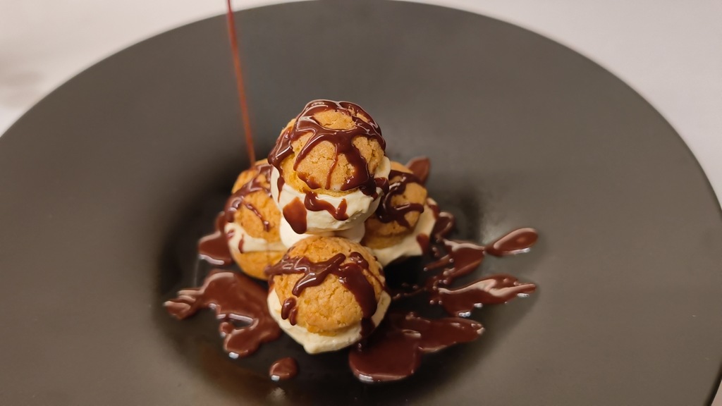 餐點的尾聲,是一份經典卻不失趣味的 香草冰淇淋泡芙佐熱法芙娜巧克力。當熱騰騰的巧克力醬淋在冰涼的香草冰淇淋上,泡芙外酥內潤的質地承接著冰與熱的對話。這份甜點的靈魂在於選用 64% 馬達加斯加單一產地的可可,帶有果酸與深邃花香,與香草的溫潤形成絕佳對比。