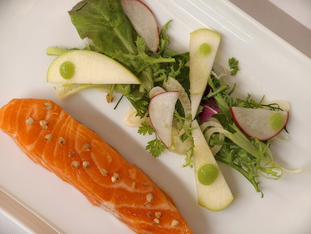 前菜部分有三道,首先是手工煙燻鱒鮭沙拉,以往品嘗鮭魚時,偶爾都會感到過於油膩,不過主廚所選用的是挪威六公斤體型的鱒鮭,脂肪並不會過多。在經過布列塔尼海鹽醃製、風乾後再以蘋果木低溫冷燻,淡淡的燻香,甚至在入口後才能感受到;醬汁也相當精采,青蘋果與山當歸,搭配茴香點綴,不張揚的氣味,很適合前菜開胃。