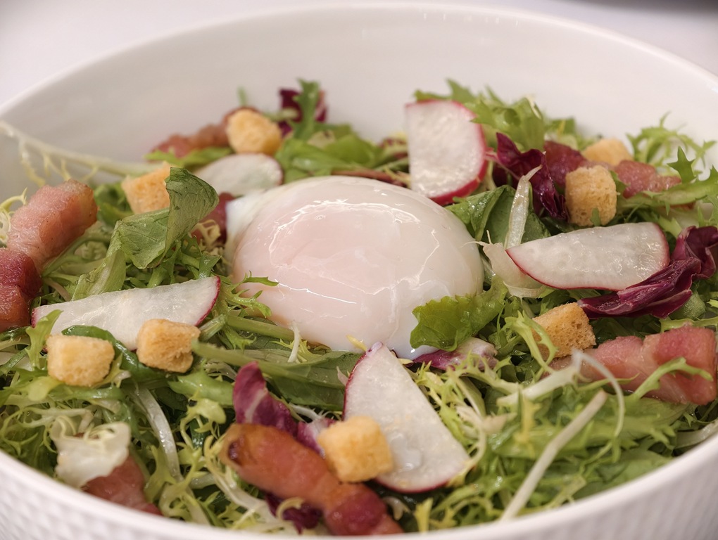 主菜前的里昂沙拉,是最能讓人放鬆的一道。酥脆的培根、焦香的麵包丁與微苦的法式綠捲萵苣構成了沙拉的主體,溫泉蛋的蛋黃緩緩流下時,讓視覺與味覺同步轉換。