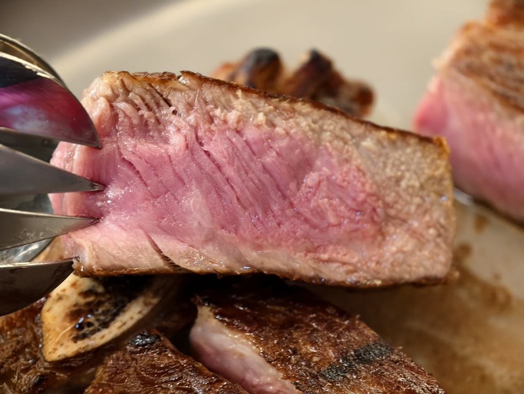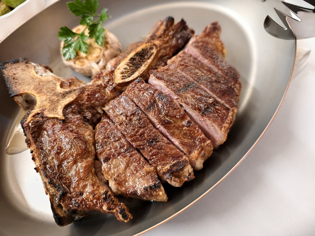 接著主角登場,這是份量驚人的 24oz 美國極光牧場乾式熟成紐約客牛排,經過 35 天乾式熟成,肉香集中、油花分布均勻。主廚使用高達 900°C 的 Montague 超級烤箱進行爐烤,將肉汁牢牢封存於內裡,外層焦香,內部濕潤柔嫩。