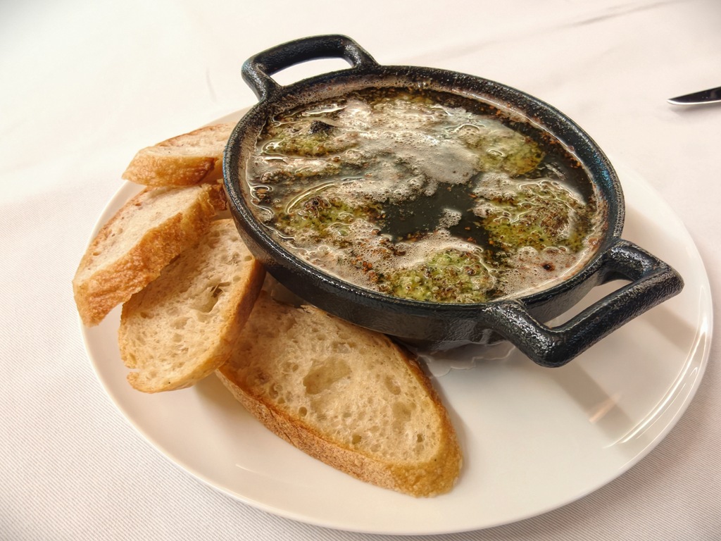 法餐自然少不了布根地烤蝸牛,以往在台灣品嘗這道料理時,都有點在賭運氣,經常遇到過於軟爛、或是過於有嚼勁。主廚所選用的布根地灰蝸牛,加上適切的烹調,蝸牛的質地柔軟中帶一點彈性,有種置身於法國餐館的感受。而奶油、歐芹與蒜頭,經過烘烤後的香氣相當迷人,甚至不用搭配麵包都不膩口。