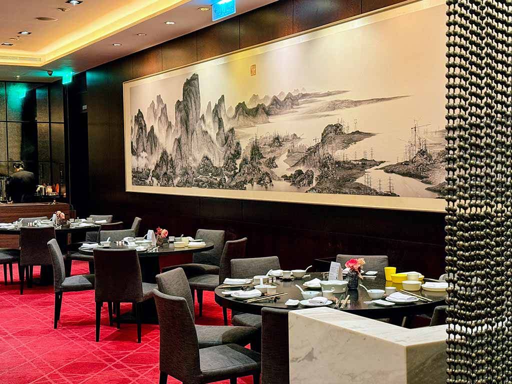 寒舍食譜的用餐環境走東方調性,以紅、黑為主色,空間設計大方且富儀式感。餐廳設有多間大小包廂,適合家庭聚會、企業宴請或名流餐敘。特別值得一提的是,牆面上懸掛的藝術品《人造仙境1號》,以現代城市線條描繪出山水意象,讓空間氛圍介於古典與當代之間,與酒店一貫的藝術氣質完美契合。