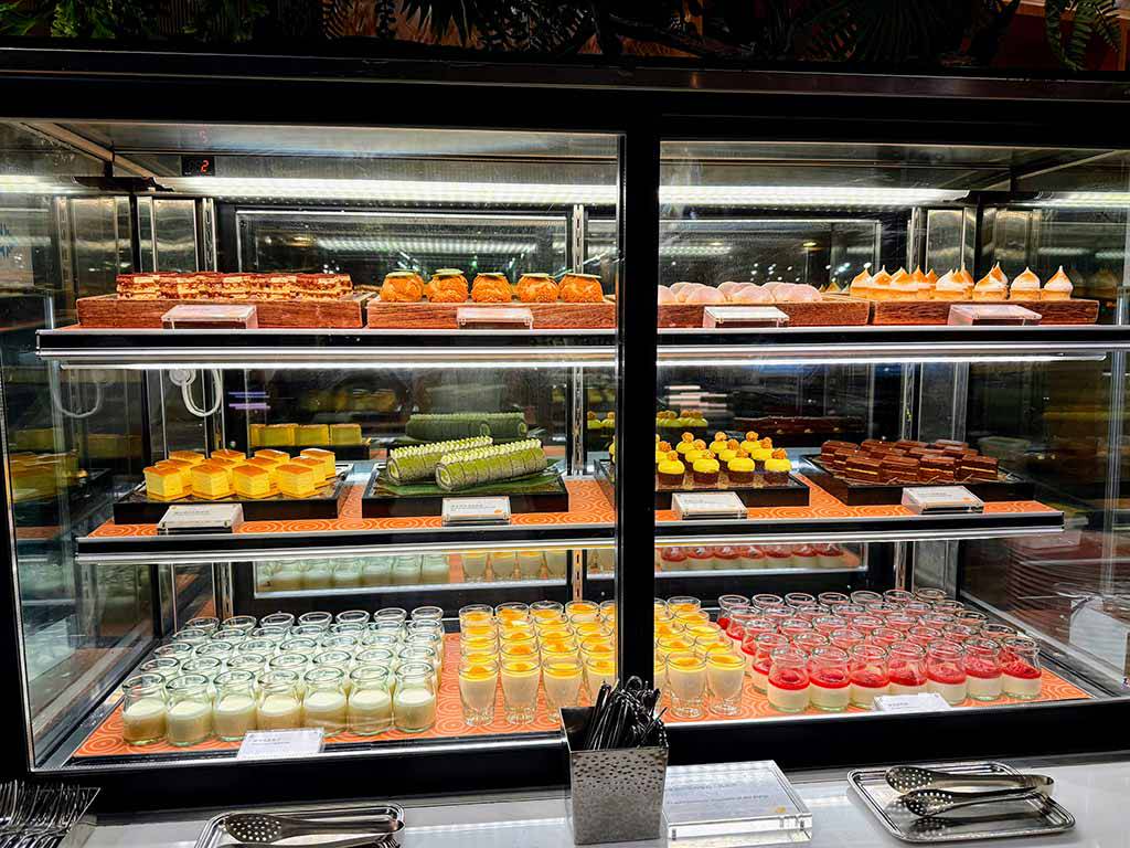 自助餐的結尾,十二廚的甜點與飲品區同樣令人驚喜。甜點櫥窗擺放著韓式乳酪蛋糕、提拉米蘇、脆皮泡芙等,每款都造型精緻、口感細膩。水果區則嚴選當季新鮮、多汁的時令水果,品質優良。