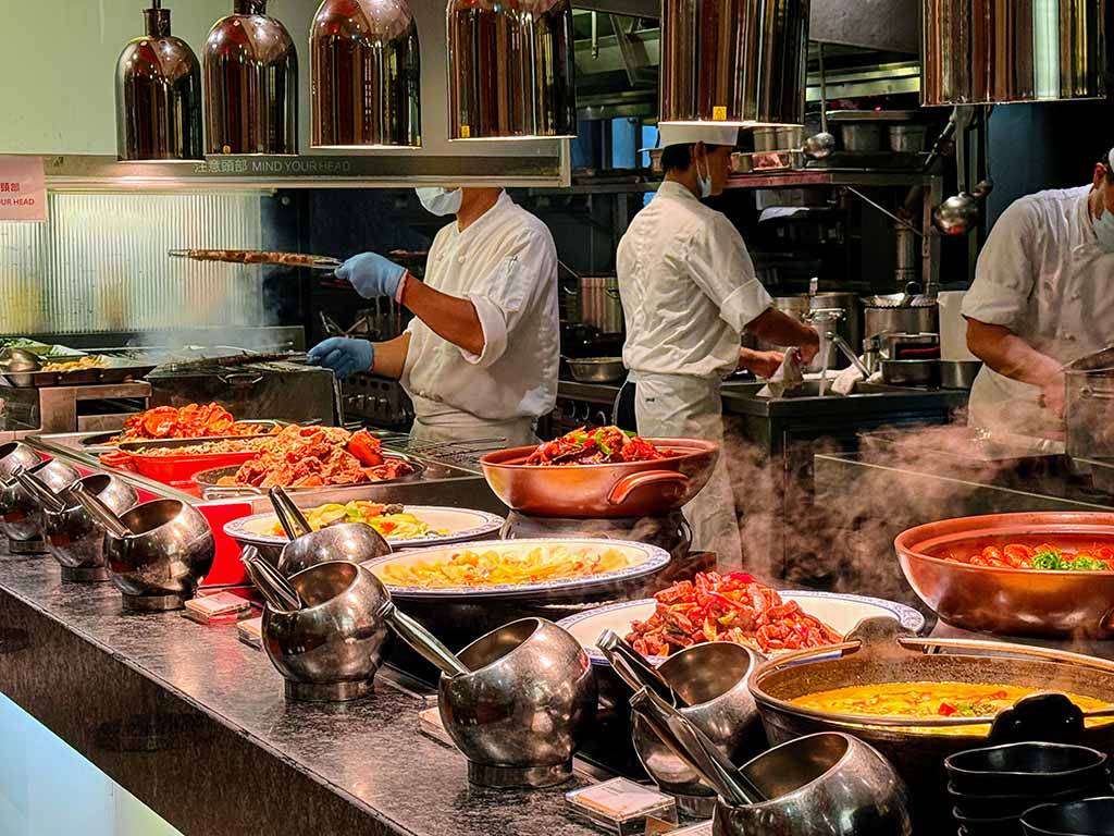 中華美食區: 菜色融合了寒舍集團旗下請客樓(米其林二星)與辰園的經典風味,像是麻油花雕雞煲、十三香黑椒牛柳等,讓賓客在自助餐中也能品嚐到單點餐廳等級的精緻桌菜風味。紅槽肉、黃金燒鴨等燒臘也是固定班底,為中式餐飲帶來豐富選擇。
