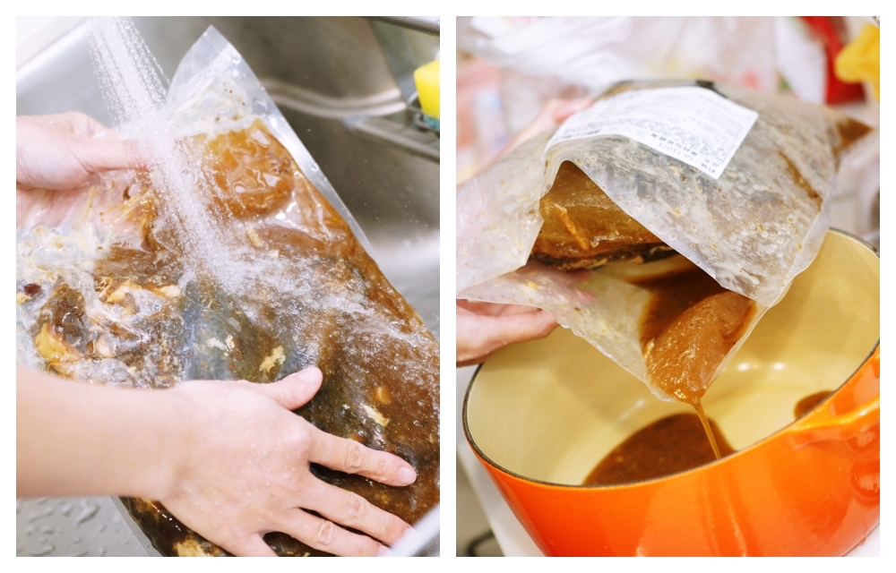 ▼將冷凍包退冰後,簡單沖水就能輕鬆拆袋,把滿滿食材倒進鍋裡的瞬間,聞到香氣真的讓人超期待!不管是爐火加熱還是電鍋蒸煮,都非常省事,忙碌下班回家也能快速上桌。