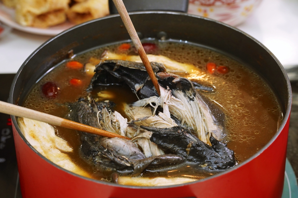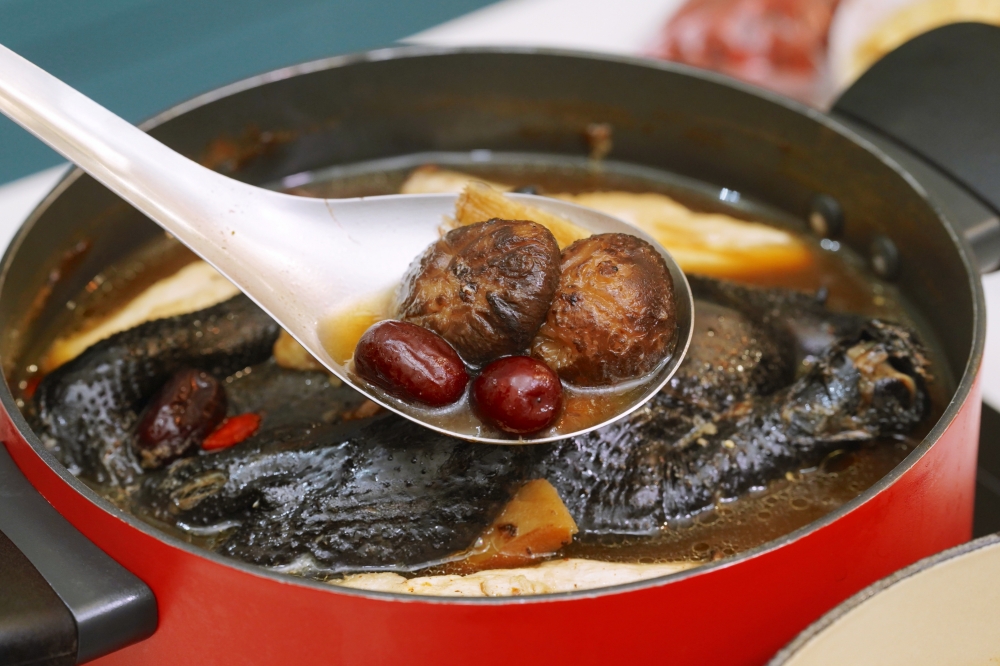 ▼黑蒜烏骨雞湯頭微微翻騰,香氣彷彿飄出畫面。嚴選台灣在地烏骨雞,燉到肉質依然緊實細嫩不乾柴,搭配發酵黑蒜、紅棗、老薑與香菇一起慢火熬煮,整鍋湯頭呈現誘人的琥珀色,喝起來甘甜溫潤、不燥不膩。
