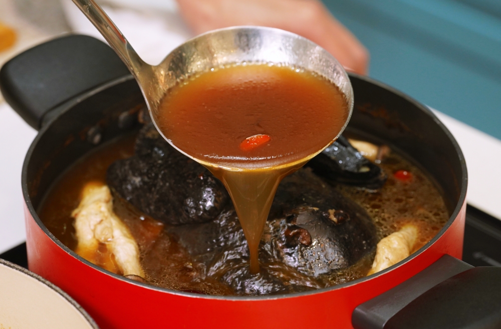 ▼湯色表層帶著細緻油光,卻不會厚重油膩,一看就知道是長時間慢火熬出的精華。黑蒜、紅棗、老薑的詞食材香氣全都融進湯裡,非常順口。