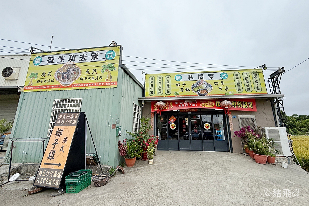 第一次來「廣式養生功夫雞」,照著導航走還差點迷路!幸好眼角瞄到一台台車鑽進小巷子,才發現原來店就在這裡~招牌不算大,加上附近全是稻田、樹林、鐵皮屋,如果不注意看真的會開過頭。它的位置就在 74 號快速道路旁、靠近環中路四段,距離烏日高鐵站開車約 5 分鐘,難怪很多外地人直接搭高鐵來吃。