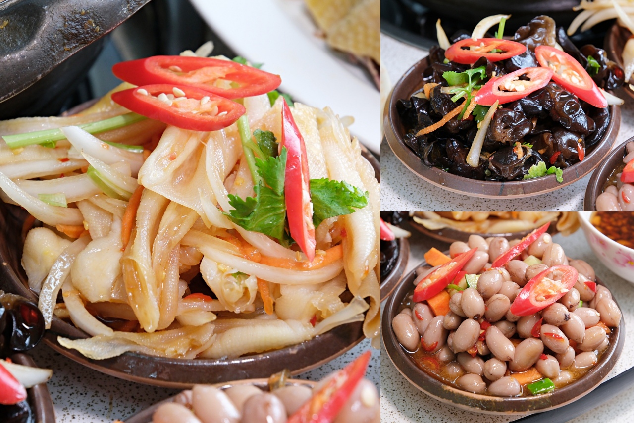 小菜完全是開胃解膩三件組。辣又涮嘴的「麻辣花生」是我最愛!綿密不軟爛一口接著一口停不下來。「涼拌鴨掌」酸辣比例剛剛好,貼心去骨帶有脆度的鴨掌配上提味醬汁,真的不能小看它。「涼拌木耳」用薄脆的雲耳製作,酸香開胃。