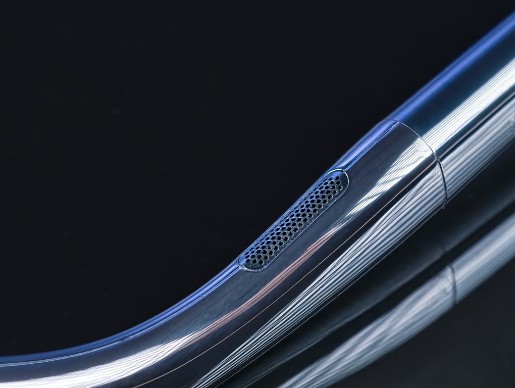 既然是「音頻眼鏡」,聲音一定是重點。米家智慧音頻眼鏡採用的是開放聲場設計,單體藏在鏡腳裡,左右各有兩組,分別設置在鏡腳下方耳朵前,與鏡腳上方的耳後。聲音沿著聲學結構導到耳朵附近,不會真正塞進耳道。