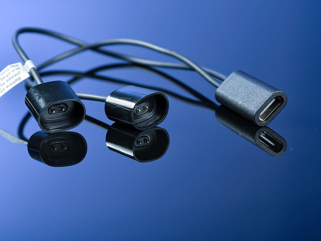 充電線以磁吸一對二設計,另一頭插上 USB Type C 電源後,直接對準鏡腳吸附即可,從 0% 充到 100% 約 1 小時。如果前一天忘記充電,充電 10 分鐘,就能再聽約 4 小時的音樂,臨時補電也很快速。