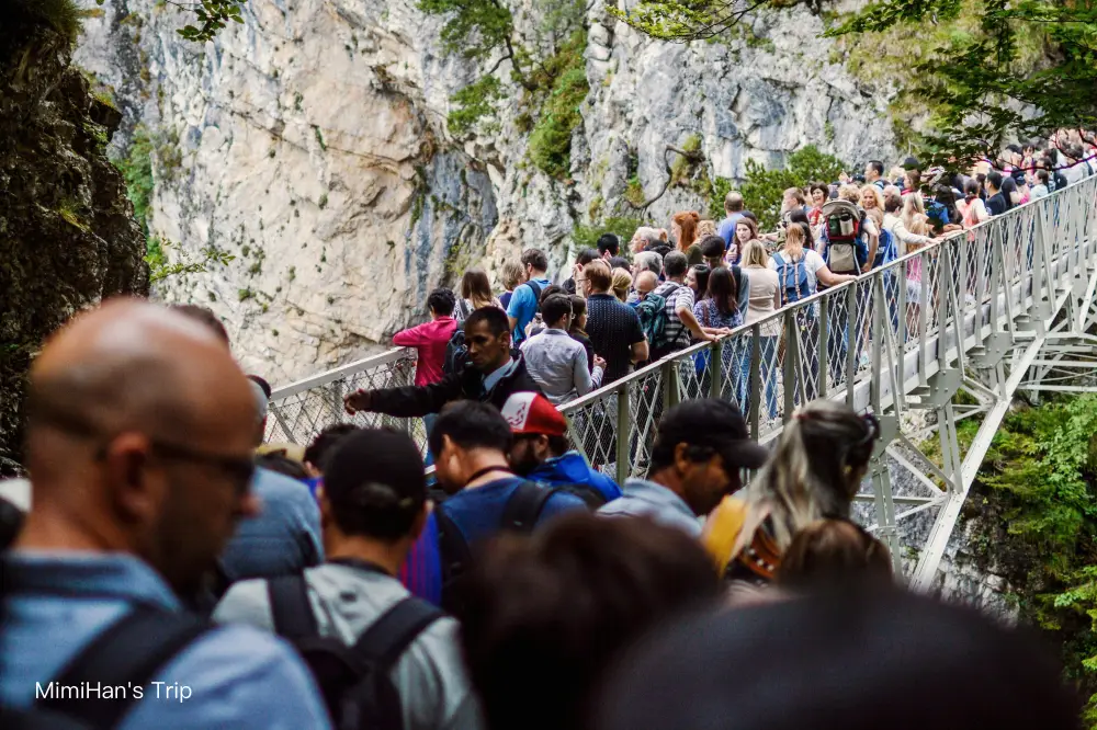 但是!但是!橋上的人潮真的很可怕,大家擠得跟等Blackpink演唱會一樣,這是一座懸索橋,人多時走起來會晃,有懼高症的人請三思。想拍空景?請在早上九點前衝上來,或是下午五點後,沒有團客時碰碰運氣。冬天橋面結冰時常會封閉,所以其他季節沒問題,但如果冬天就要有看不到的心理準備。