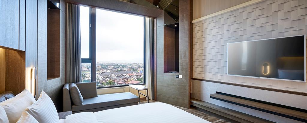 房型選擇非常多元,從雙人房、家庭房到無障礙房與VIP套房都有。我這次入住的是「松讚雙人房」,房間空間約11坪,配備58吋4K液晶電視、大理石洗手台、乾濕分離衛浴、蛋型浴缸與SPA花灑淋浴頭,連浴缸選項都能挑喜歡的類型。落地窗外就是羅東市景,沙發座位很適合放空。